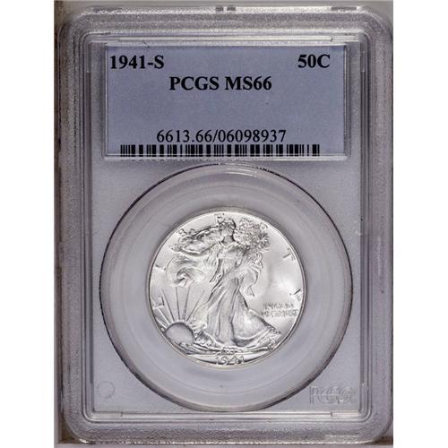 <B>1941-S<50C> MS66 PCGS.</B></I> Fully white, with splendid luster. There are few abrasions, although a flyspeck is noted here and there. This example is boldly struck, with nearly full skirt lines, although the usual weakness on the central devices and the eagle's right (facing) leg is present. PCGS has graded only six finer (3/06). <BR><BR><B>Important notice:</B> Heritage usually auctions material at the rate of 200-250 lots per hour. On some occasions eBay Live bid software or the Internet may not be able to keep up with the pace of the auction. We recommend placing a realistic absentee bid now as insurance to avoid disappointment. Occasionally the auctioneer may eliminate or reject an eBay Live bid, and the auctioneer may also reopen a lot after the close of the eBay live bidding (usually because we missed an audience bid), and may reject your bid even if it shows you as the winning bidder. By bidding via eBay Live, you agree that Heritage may award the lot to another bidder at its sole discretion under the circumstances described above or any other reasonable circumstances. Since eBay bids are not shown to us until we open the lot on the floor, we treat those bids just like floor bids. In most cases the floor responds before the eBay bid is presented to us, due to Internet lag time, so for consistency we have made it a policy that floor bids are always considered first over tie eBay live bids. Also please note that all Heritage lots purchased through eBay Live carry a 20% Buyer's Premium. Please make sure you read the Terms and Conditions before you bid. This lot is being auctioned in conjunction with a live floor auction by Heritage Galleries & Auctioneers. All final auction and invoice information will be supplied by Heritage Galleries & Auctioneers, and all other information should be considered preliminary. Lot:2994 <BR><BR><B>Winning Notification and Billing:</B> After the FINAL session in this auction is complete, Heritage will send e-mail and snail mail invoices. This process normally takes several days. All final auction and invoice information will be supplied by Heritage Galleries & Auctioneers, and all other information should be considered preliminary. <BR><BR>This auction will be conducted on a live auction floor and over the Internet through eBay Live. If you choose to place an absentee bid, please take a moment to <font color='#0000ff'><u><a href='http://pages.ebay.com/liveauctions/help/before/laabsentee.html'>learn how eBay Live absentee bidding works</a></u></font><font color='#000000'>