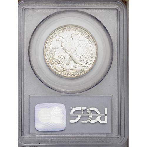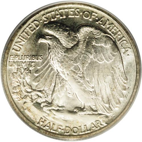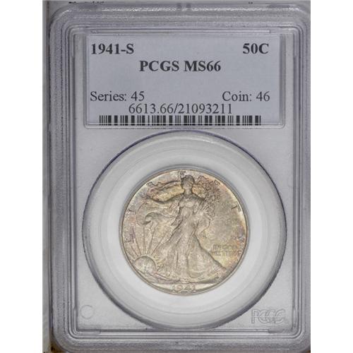 <B>1941-S<50C> MS66 PCGS.</B></I> Richly variegated forest-green, cherry-red, and aquamarine patina endows the obverse. The reverse is only lightly toned in gold and ivory-gray. Immaculate aside from a faint vertical mark concealed on the back of the wing. The 1941-S is the key to the popularly collected Walker short set, and beautifully toned Premium Gems are subject to voracious demand.