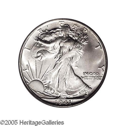<B>1941-S<50C> MS66 PCGS.</B></I> The paucity (when compared to the other short set dates, 1941-1947) of 1941-S Walking Liberty half dollars certified above the MS64 level is due primarily to striking deficiencies. Bothersome abrasions also play a part, however. The lovely premium Gem that we offer here is predominantly ice-white with wisps of faint dappled tan color. The strike is not complete, as is typical of this issue, but may be considered above average, as some definition is beginning to emerge over the central highpoints and atop Liberty's head.
