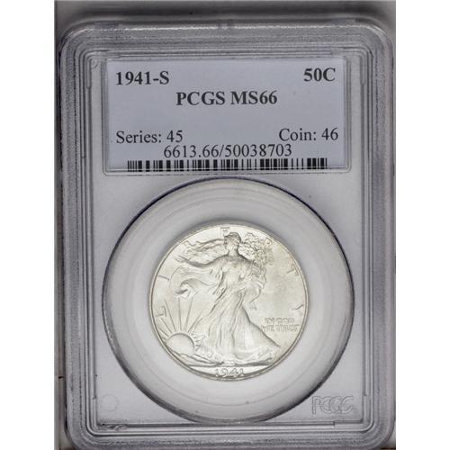 <B>1941-S<50C> MS66 PCGS.</B></I> With few abrasions to report and a decent strike, this lovely Premium Gem would form the centerpiece of any set of late date Walking Liberty half dollars. Although the icy surfaces are largely brilliant, we draw attention to a thin coating of milky-gray patina over each side.