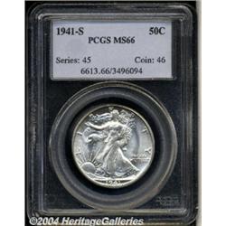 <B>1941-S<50C> MS66 PCGS.</B></I> Long considered the key issue in the Short Set, the 1941-S is not only scarce in the absolute sense but it is a strike rarity as well. This is a lovely Premium Gem example that has swirling mint luster and striking details that are significantly sharper than the usual '41-S. Population: 199 in 66, 6 finer (3/04). <BR><BR><B>Important notice:</B> Heritage usually auctions material at the rate of 200-250 lots per hour. On some occasions eBay Live bid software or the Internet may not be able to keep up with the pace of the auction. We recommend placing a realistic absentee bid now as insurance to avoid disappointment. Occasionally the auctioneer may eliminate or reject an eBay Live bid, and the auctioneer may also reopen a lot after the close of the eBay live bidding (usually because we missed an audience bid), and may reject your bid even if it shows you as the winning bidder. By bidding via eBay Live, you agree that Heritage may award the lot to another bidder at its sole discretion under the circumstances described above or any other reasonable circumstances. Since eBay bids are not shown to us until we open the lot on the floor, we treat those bids just like floor bids. In most cases the floor responds before the eBay bid is presented to us, due to Internet lag time, so for consistency we have made it a policy that floor bids are always considered first over tie eBay live bids. Also please note that all Heritage lots purchased through eBay Live carry a 20% Buyer's Premium. Please make sure you read the Terms and Conditions before you bid. </span></font></tr></table></td></tr></table>