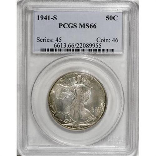<B>1941-S 50C MS66 PCGS.</B></I> This highly lustrous Premium Gem offers a touch of beige patina at the periphery. Well struck for this short-set issue, and difficult to find any finer; PCGS has graded just six such pieces (6/07).<BR><BR><B>Coin Engraver:</B> Adolph A. Weinman<BR><BR><b>Shipping:</b> Coins & Currency (<a target="_blank" href="http://www.heritageauctions.com/common/shipping.php">view shipping information</a>\)