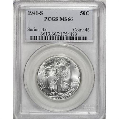 <B>1941-S 50C MS66 PCGS.</B></I> A carefully preserved short-set Premium Gem, generally well struck with partial definition on the branch hand. Conditionally rare any finer, with only six such pieces certified by PCGS (8/07).<BR><BR><B>Coin Engraver:</B> Adolph A. Weinman<BR><BR><b>Shipping:</b> Coins & Currency (<a target="_blank" href="http://www.heritageauctions.com/common/shipping.php">view shipping information</a>)