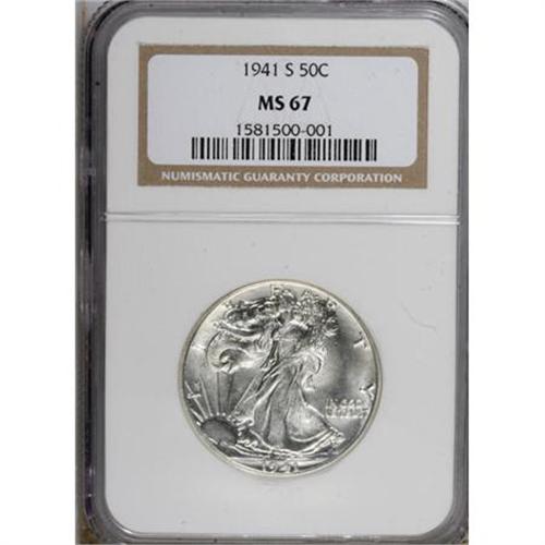 <B>1941-S 50C MS67 NGC.</B></I> This brilliant Superb Gem has potent luster, and retains a freshly minted appearance despite the passage of two-thirds of a century. The strike is decidedly above average, particularly on Liberty's cheek and the skirt lines. The 1941-S is the key to the popular 1941-1947 short set.<BR><BR><B>Coin Engraver:</B> Adolph A. Weinman<BR><BR><b>Shipping:</b> Coins & Currency (<a target="_blank" href="http://www.heritageauctions.com/common/shipping.php">view shipping information</a>)
