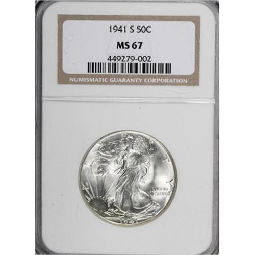 <B>1941-S 50C MS67 NGC.</B></I> A Superb Gem example of this important key-date issue with frosty silver luster and excellent design details. Both sides are brilliant. This is an impressive example of this scarce issue and would fit nicely in a high-grade set of Walkers. Neither NGC or PCGS have graded a finer example of this date. Census: 16 in 67, 0 finer (8/07).<BR><BR><B>Coin Engraver:</B> Adolph A. Weinman<BR><BR><b>Shipping:</b> Coins & Currency (<a target="_blank" href="http://www.heritageauctions.com/common/shipping.php">view shipping information</a>)