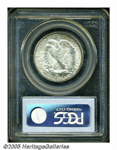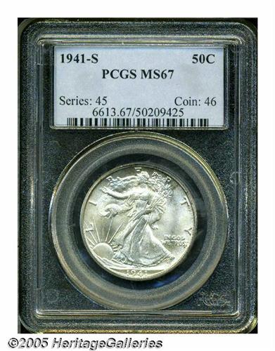 <B>1941-S<50C> MS67 PCGS.</B></I> Even before it became popular to collect Walking Liberty Halves from the Short Set some thirty years ago, the '41-S was well-known as the key to the series. It has always been at the forefront in pricing guides and in the hearts of collectors. It is actually not the most difficult strike rarity, that honor goes to the 1944-S. Nor is it the most elusive in MS67. And several other issues have a lower or equivalent number of total coins certified. But the mystique has survived, and today the '41-S retains its luster as the premier "must have" coin from the Short Set.<BR> We have not recently seen a 1941-S that has surfaces as immaculately preserved as this one. There simply are no abrasions visible to the unaided eye. In addition, the striking details are dramatically defined on each side. The mint luster has a bright, satiny glow and is accented with just a hint of mottled russet toning. An outstanding coin that must be seen to be fully appreciated. Population: 6 in 67, none finer at either service (6/05).