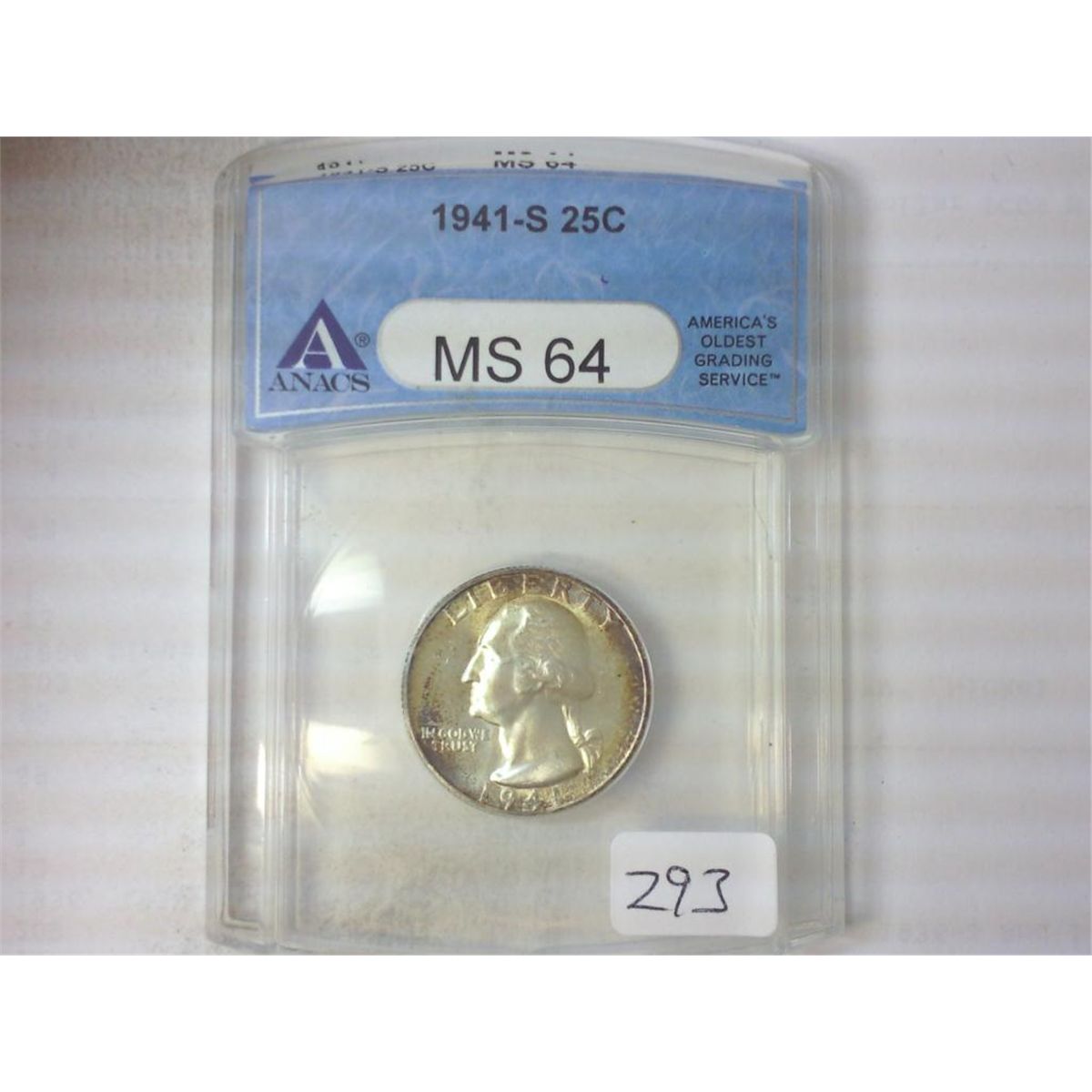 1941-S WASHINGTON SILVER QUARTER ANACS MS64