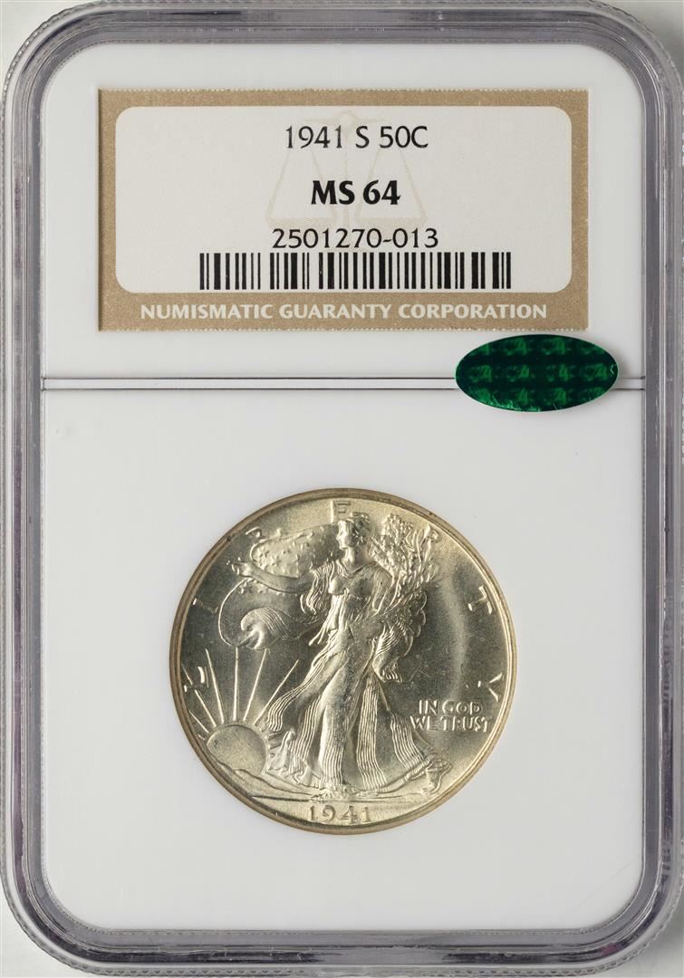 One 1941-S Walking Liberty Half Dollar Coin NGC MS64 CAC. NGC Certified.