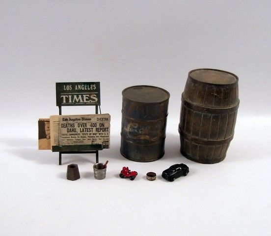 1941 Screen Used Miniature Props - Steven Spielberg himself has called his over-the-top "1941" (1979) the noisiest movie ever made! That it was, with an all star cast including Dan Aykroyd, John Belushi and even Toshiro Mifune! It also included some of the greatest (and sadly, because of the onset of CGI, one of the last) full set miniature work ever created for a motion picture. That included the recreation of Hollywood Blvd (the largest full set miniature in film history), and the Santa Monica Pier complete with an entire amusement park (including the infamous runaway Farris Wheel!). These are a few rare pieces of remaining miniatures. They were created by the legendary Greg Jein especially for the sets. They include produce tins, a bottle, a wood "pickle" barrel, metal barrel, cars, as well as a Los Angeles Times stand, along with detailed newspapers, from the Times, the Honolulu Star-Bulletin, a Life Magazine, and a "Shadow" comic book. (Pieces range from approx 0.5"x0.5" to 2.5"x2.5").