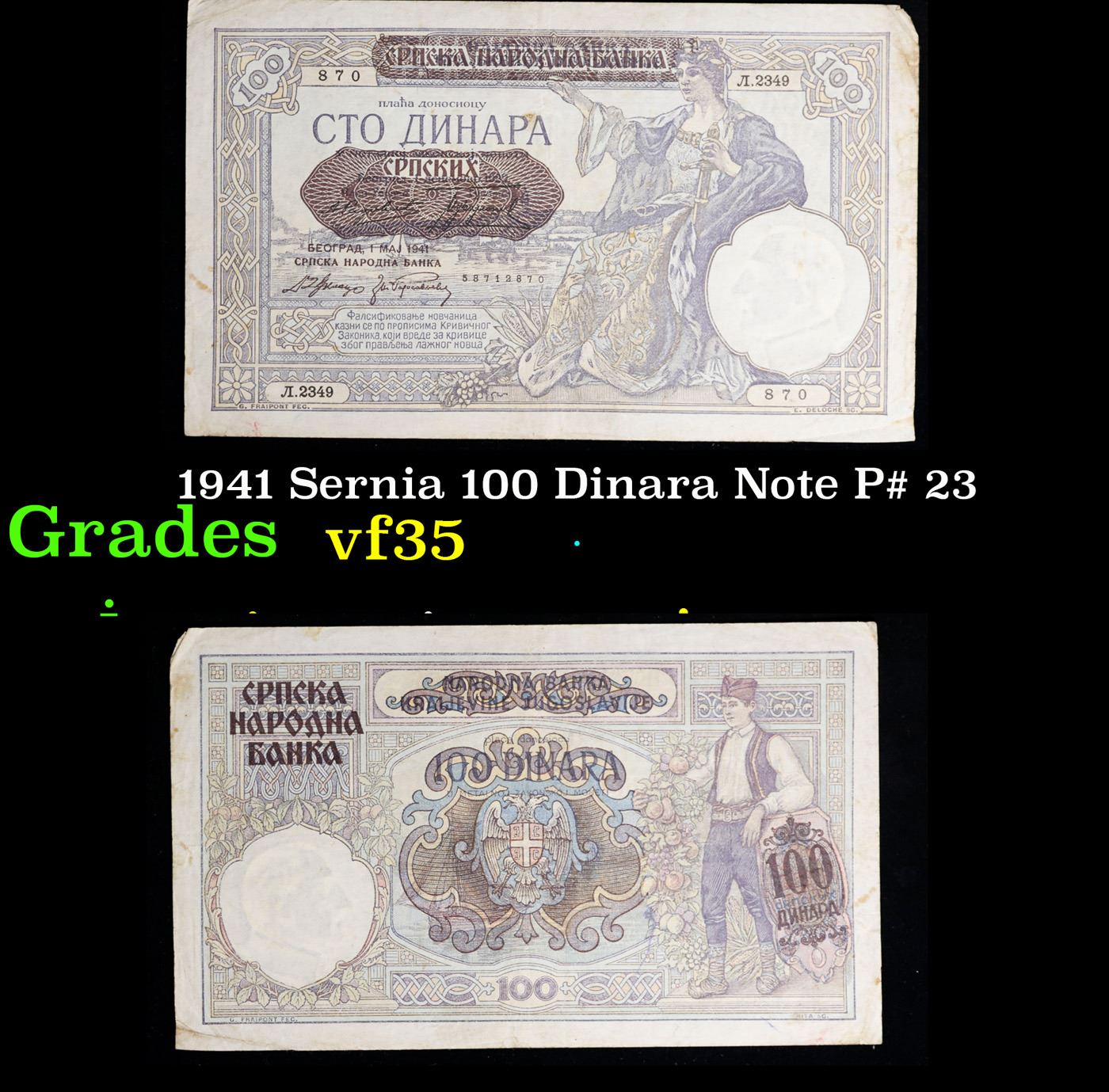 1941 Sernia 100 Dinara Note P# 23 Grades vf++.