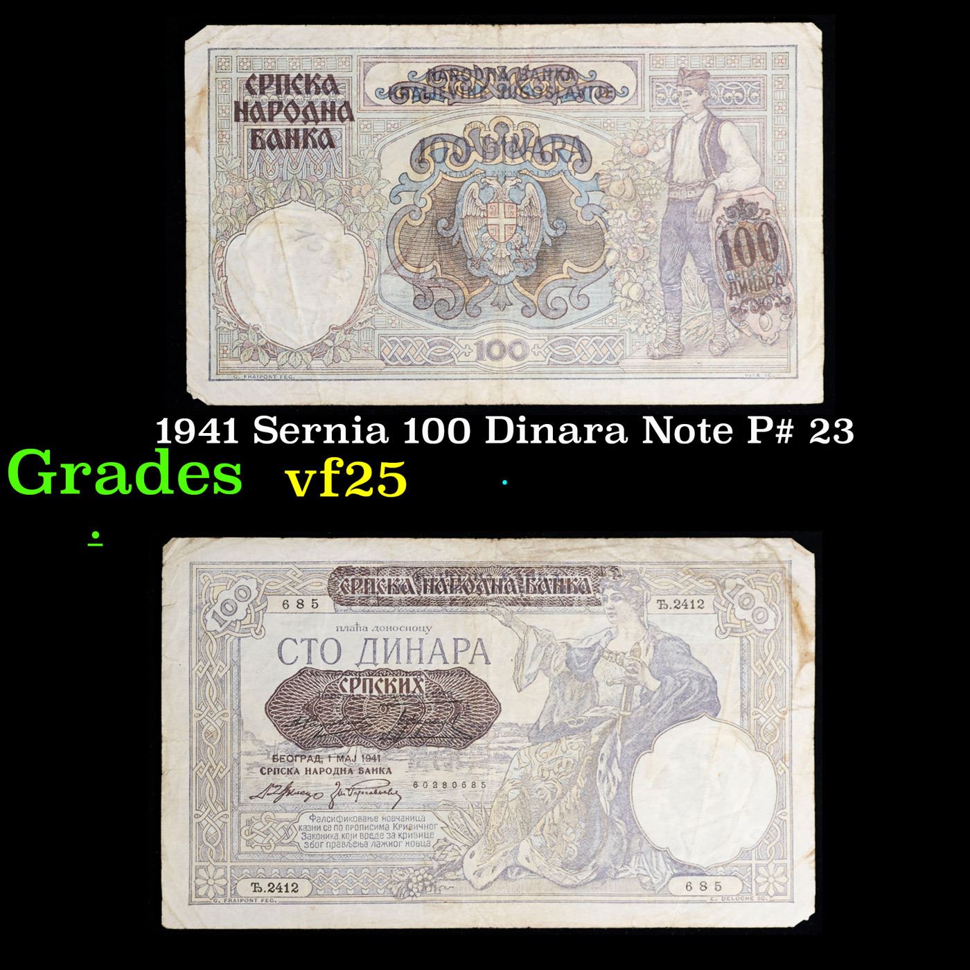1941 Sernia 100 Dinara Note P# 23 Grades vf+.