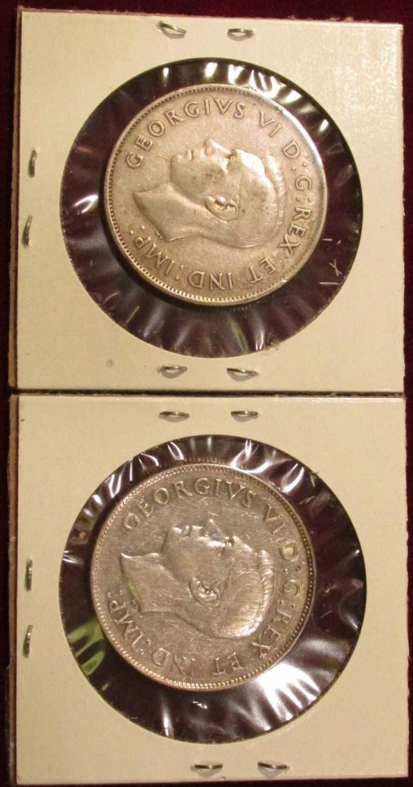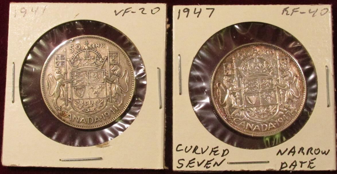 1941 Very Fine & 47 Curved 7 Narrow Date EF Canada Silver Half Dollars. Catalog value $50.00.