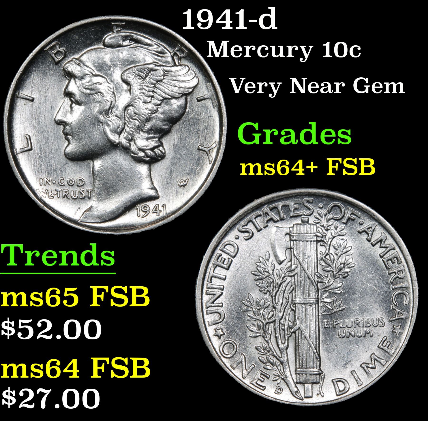 1941-d . Very Near Gem Mercury Dime 10c Grades Choice Unc+ FSB.