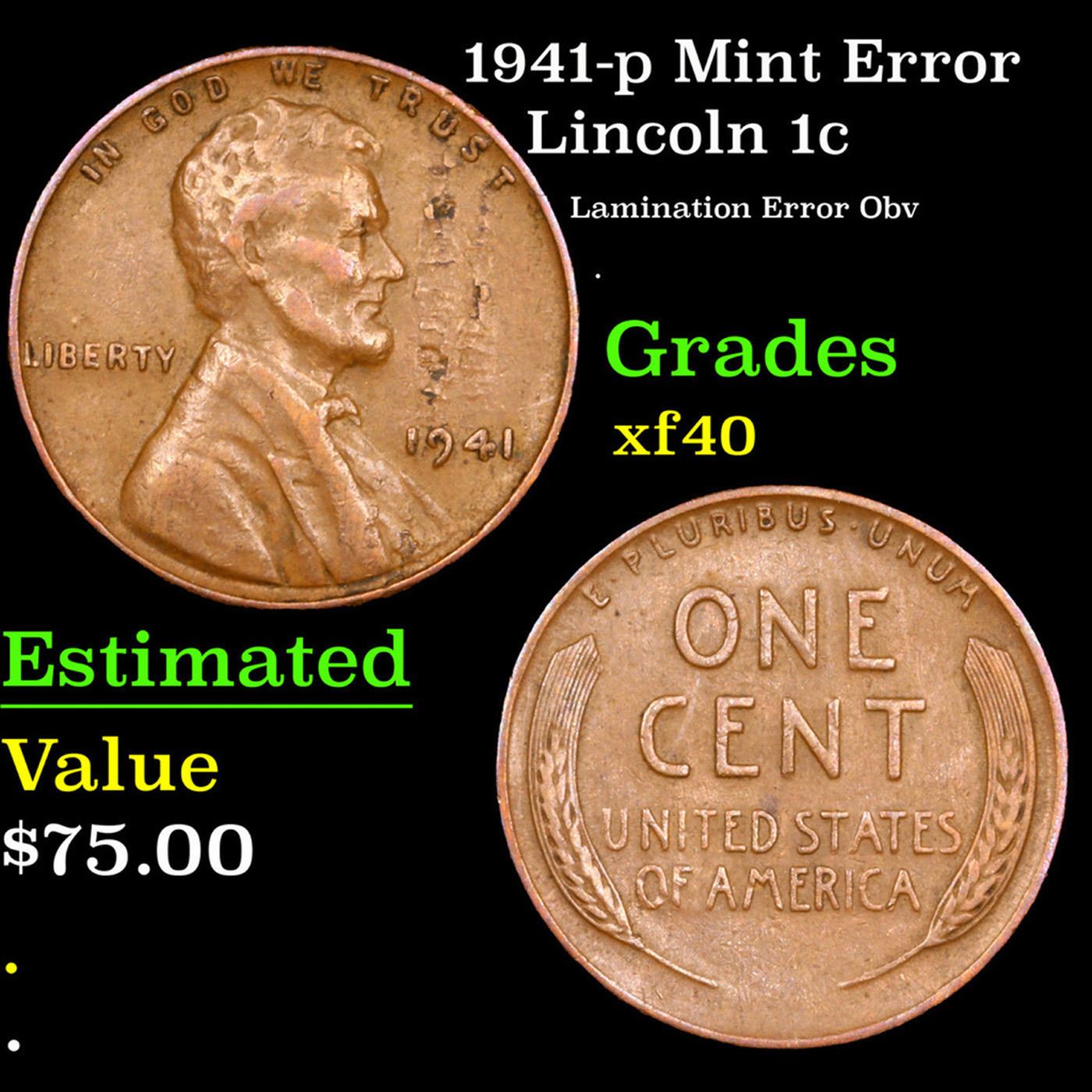 1941-p Mint Error Lincoln Cent 1c Grades xf.