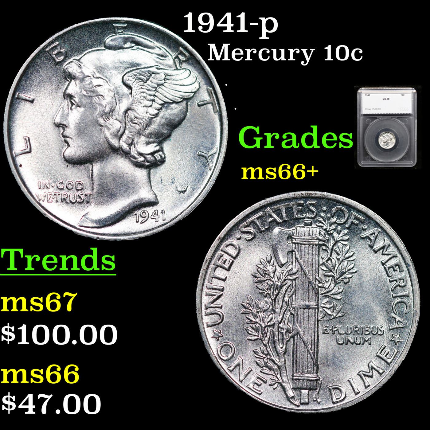 1941-p Mercury Dime 10c Graded ms66+ By SEGS.