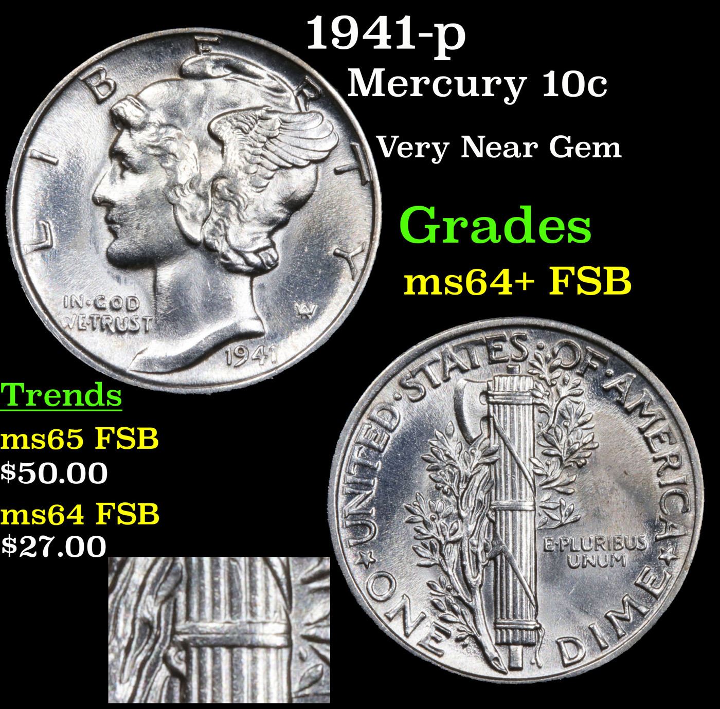 1941-p Mercury Dime 10c Grades Choice Unc+ FSB.