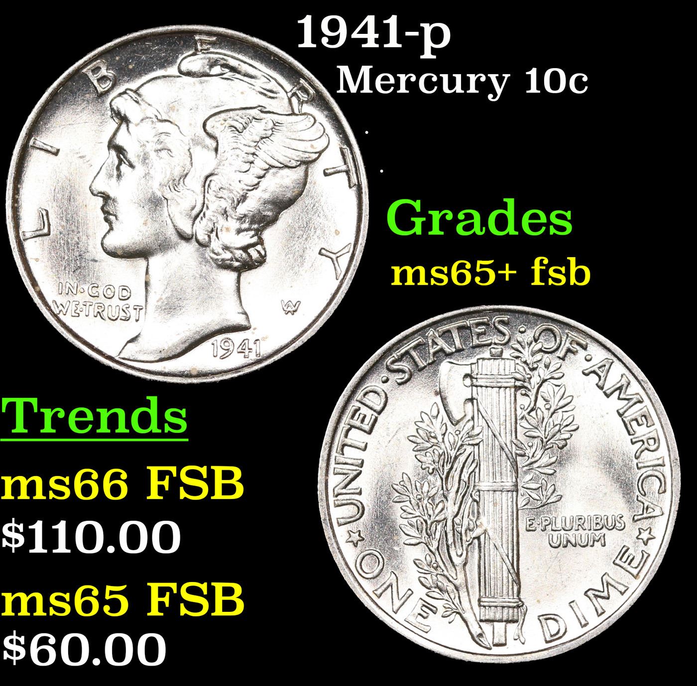 1941-p Mercury Dime 10c Grades GEM+ FSB.