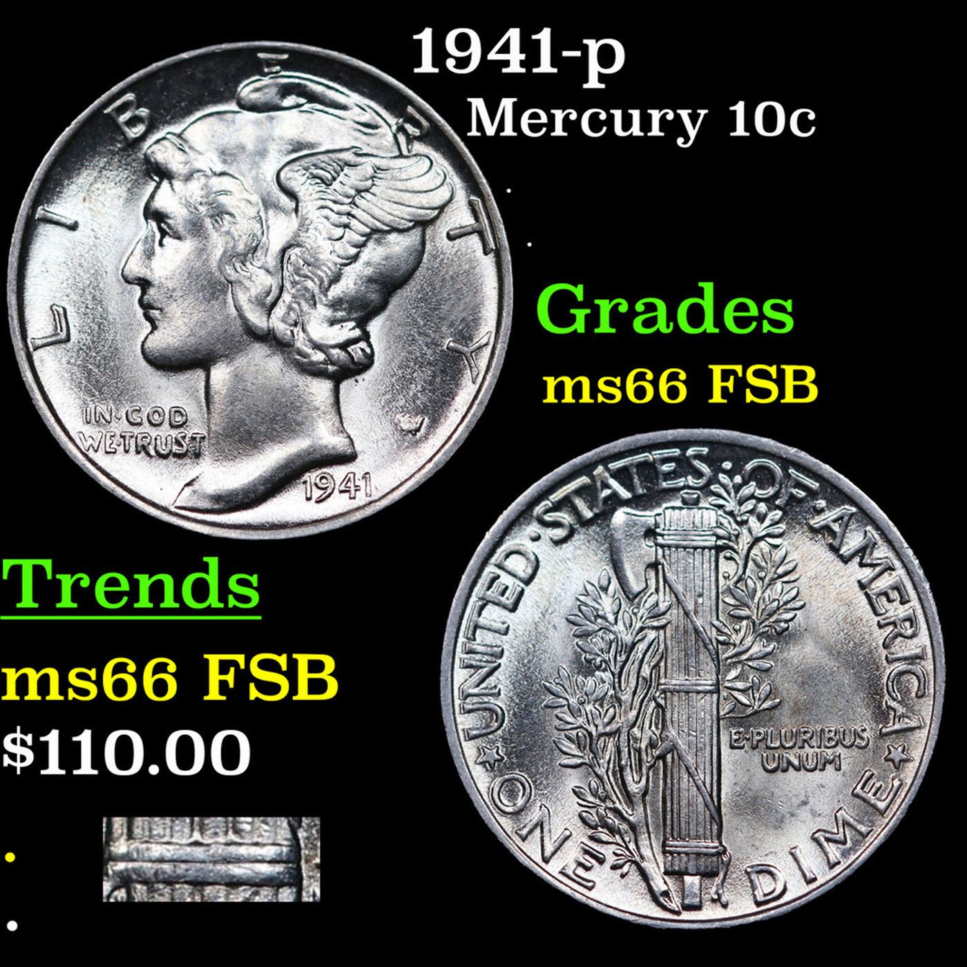 1941-p Mercury Dime 10c Grades GEM+ FSB.