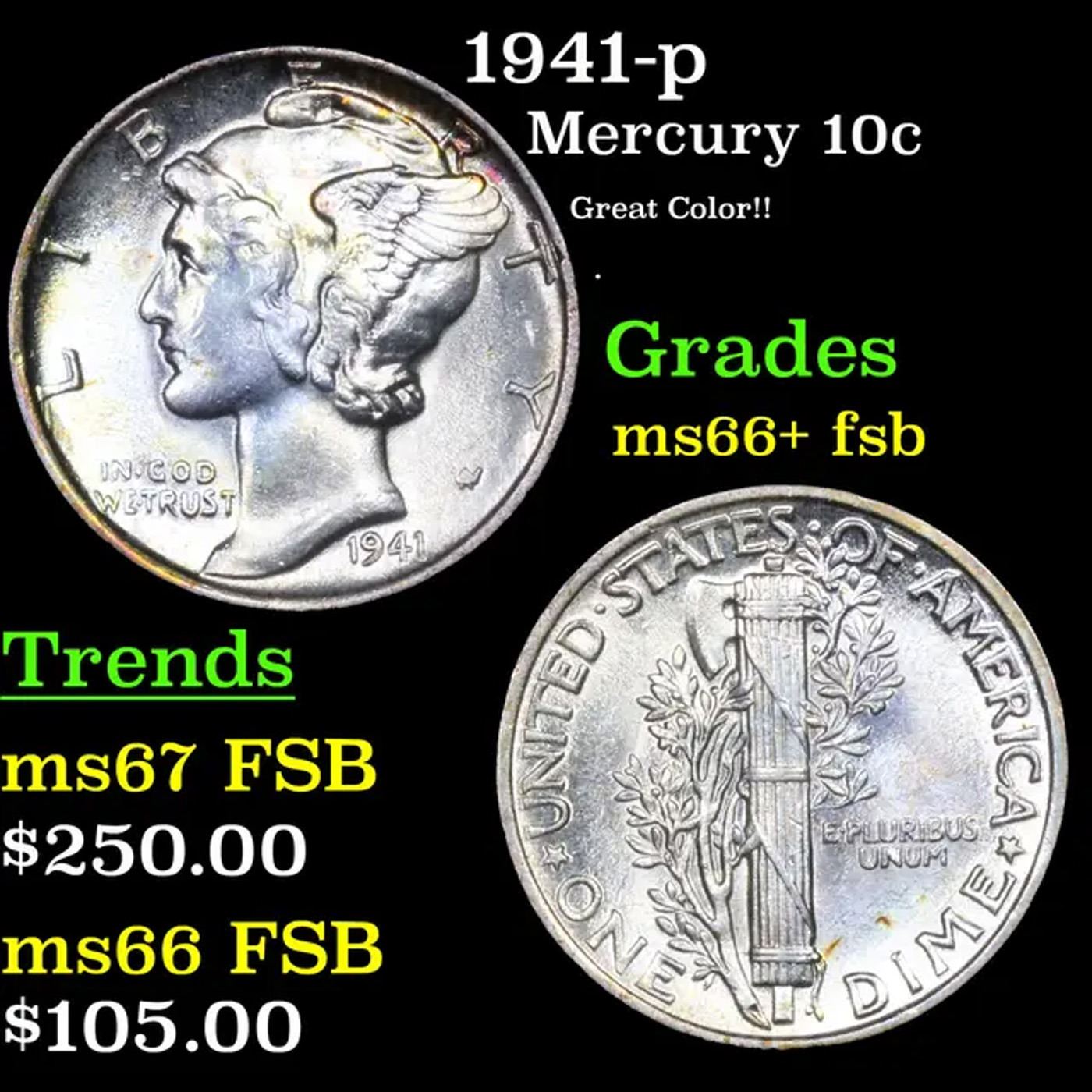 1941-p Mercury Dime 10c Grades GEM++ FSB.