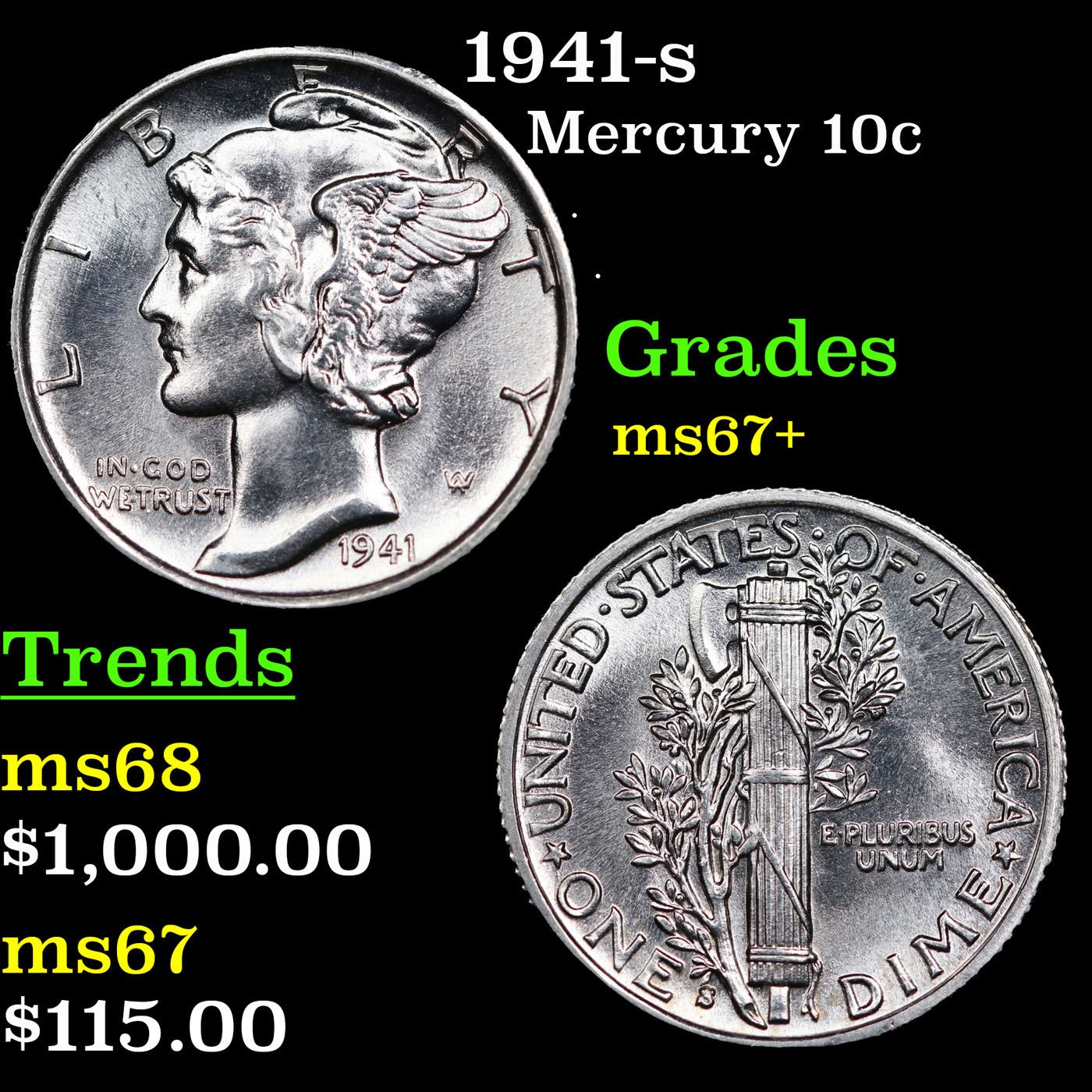 1941-s Mercury Dime 10c Graded ms67+ BY SEGS.