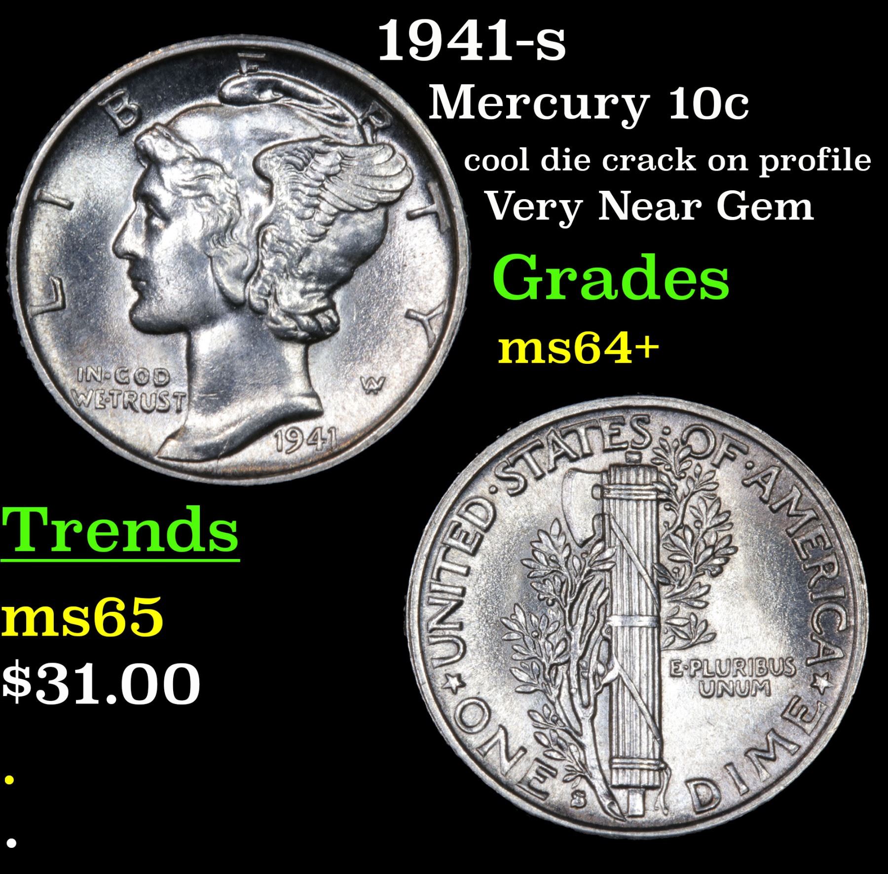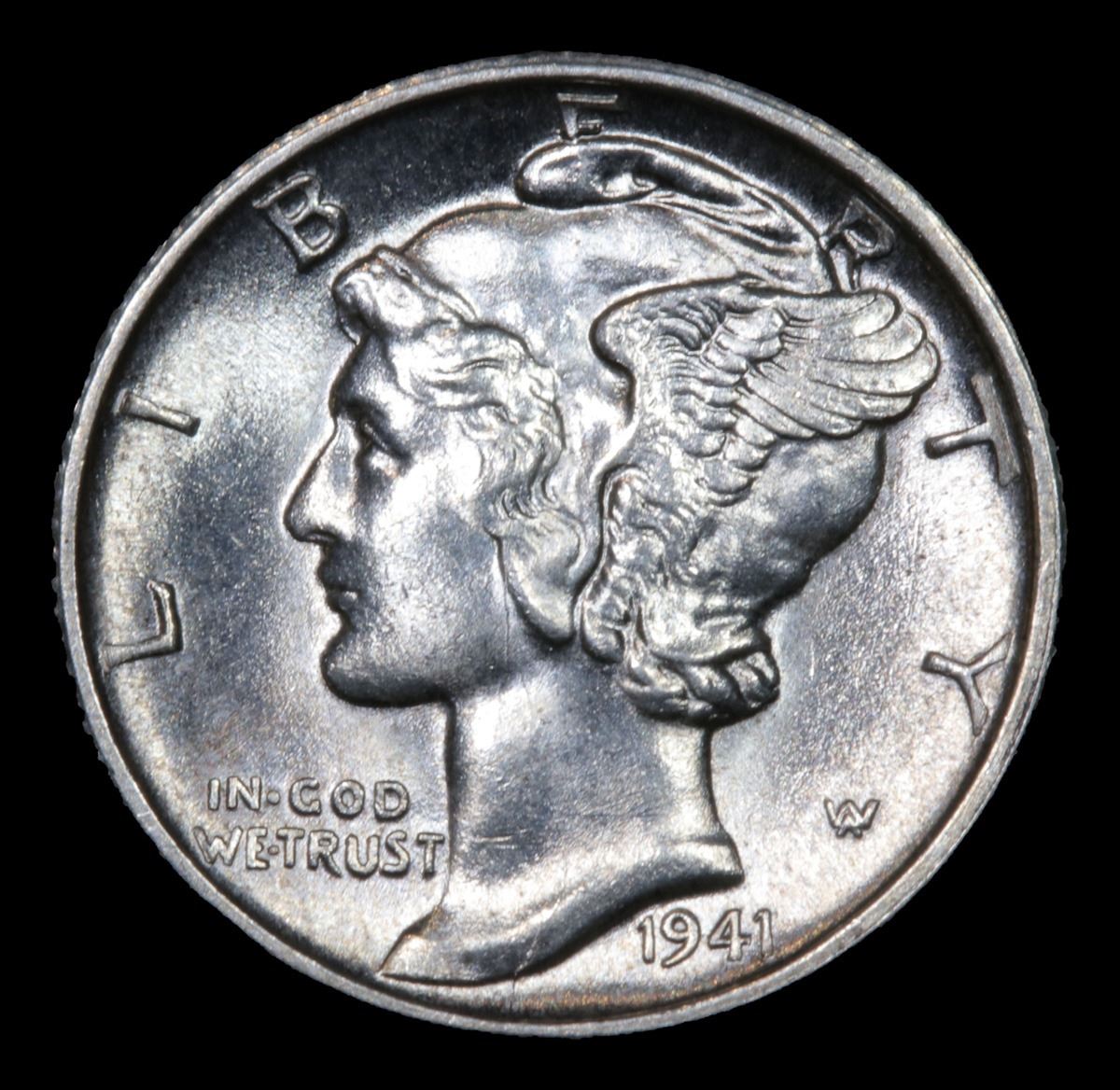1941-s cool die crack on profile Very Near Gem Mercury Dime 10c Grades Choice+ Unc.