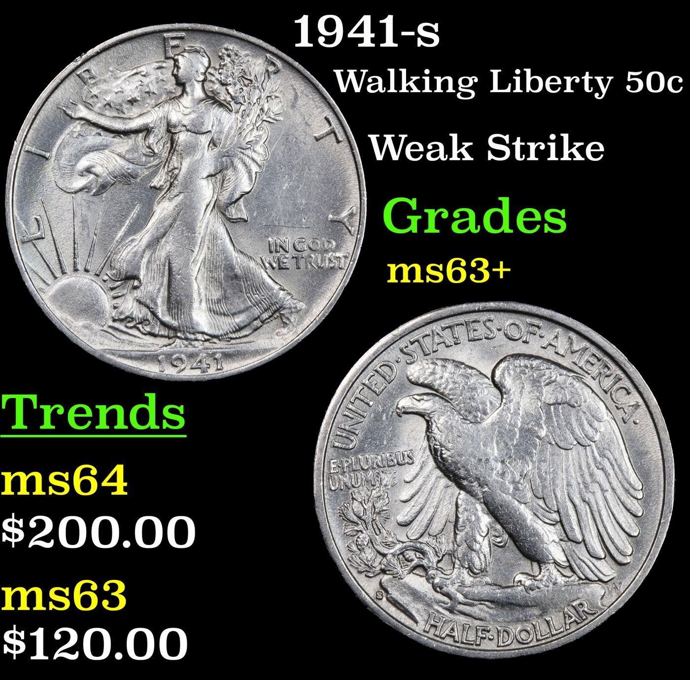 1941-s Walking Liberty Half Dollar 50c Grades Select+ Unc. What you are looking at IS NOT WEAR. This is an Uncirculated Walker with a weak strike. Very Cool in my opinion and worth owning, especially as an example of how strike can disguise itself as wear on a walker.