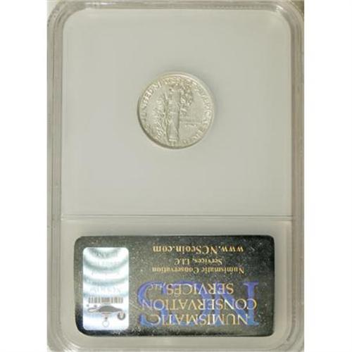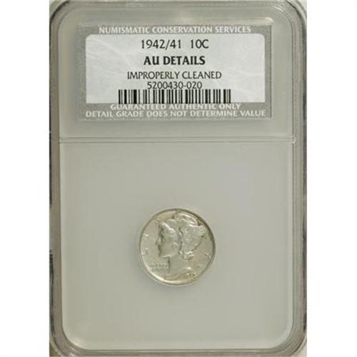 <B>1942/1 10C --Improperly Cleaned--NCS. AU Details.</B></I> This pearl-gray key date dime is lackluster from a cleaning, but the sharpness of the wing and fasces confirms only brief circulation. No marks merit mention. The 2/1 overdate is obvious.<BR><BR><B>Coin Engraver:</B> Adolph A. Weinman<BR><BR><b>Shipping:</b> Coins & Currency (<a target="_blank" href="http://www.heritageauctions.com/common/shipping.php">view shipping information</a>)