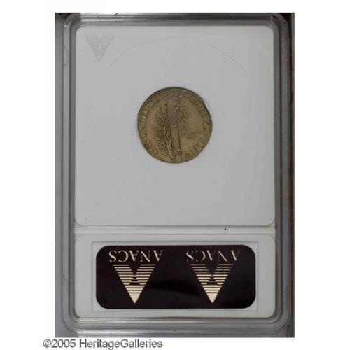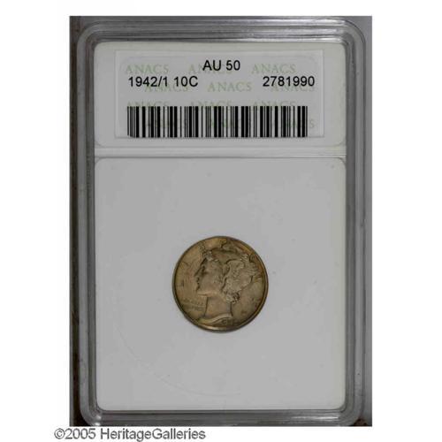 <B>1942/1<10C> AU50 ANACS.</B></I> FS-010.7. Gentle lime and rose colors enrich this sharp and slightly glossy key date dime. Wear is very minimal, and no abrasions require singular mention. A blatant, naked eye overdate.