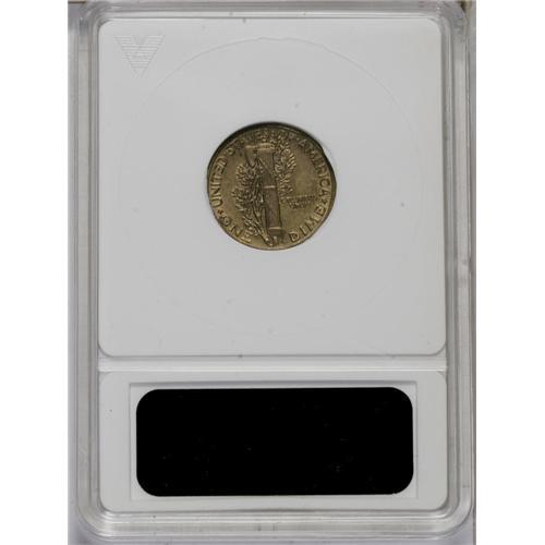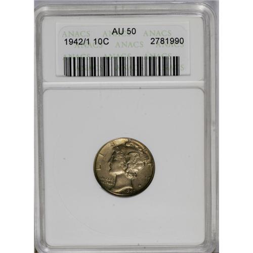 <B>1942/1<10C> AU50 ANACS.</B></I> FS-010.7. This glossy lime and cream-gray key date dime has bold details and no obtrusive marks. The overdate for the Philadelphia 1942/1 is much more distinctive than on its Denver Mint counterpart.