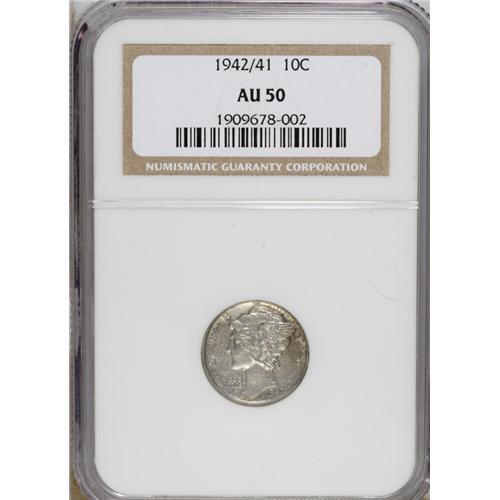 <B>1942/1 10C AU50 NGC.</B></I> FS-101, formerly FS-010.7. The highpoint design details are evenly worn, and the silver-gray surfaces also show some dappled plum coloration. Scattered small surface marks are evident on both sides of this key date Mercury dime.<BR><BR><b>Shipping:</b> Coins & Currency (<a target="_blank" href="http://www.heritageauctions.com/common/shipping.php">view shipping information</a>)