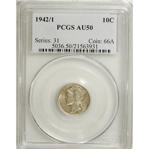 <B>1942/1 10C AU50 PCGS.</B></I> The boldest 20th century overdate, represented here by a lightly circulated steel-gray piece that retains much of its original luster. Glints of gold and rose grace the obverse, while the reverse has similar colors and a number of thin abrasions and nicks, particularly in the right obverse field.<BR><BR><b>Shipping:</b> Coins & Currency (<a target="_blank" href="http://www.heritageauctions.com/common/shipping.php">view shipping information</a>)