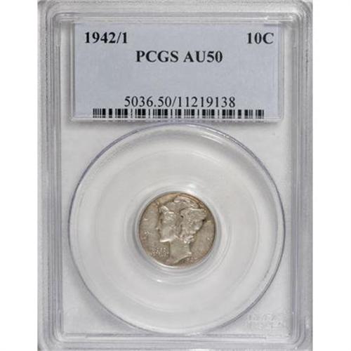 <B>1942/1 10C AU50 PCGS.</B></I> FS-101, formerly FS-010.7. Dusky rose-gold and sky-gray toning confirms the originality of this richly detailed key date dime. As always, the 1 underdigit is obvious to the unaided eye.<BR><BR><b>Shipping:</b> Coins & Currency (<a target="_blank" href="http://www.heritageauctions.com/common/shipping.php">view shipping information</a>)