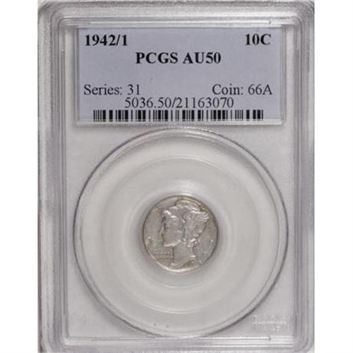 <B>1942/1 10C AU50 PCGS.</B></I> FS-101, formerly FS-010.7. Delicate gold and steel-blue enriches this partly lustrous key date dime. As always, the overdate is bold. The right reverse field has a couple of faded marks.<BR><BR><B>Coin Engraver:</B> Adolph A. Weinman<BR><BR><b>Shipping:</b> Coins & Currency (<a target="_blank" href="http://www.heritageauctions.com/common/shipping.php">view shipping information</a>)