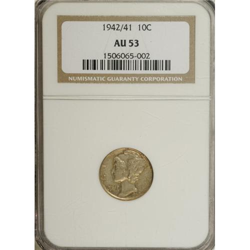 <B>1942/1 10C AU53 NGC.</B></I> This lightly worn lavender-gold example's minimally marked surfaces retain a noticeable degree of luster. This classic overdate is so prominent that it was first reported by numismatists the year after it was issued.<BR><BR><b>Shipping:</b> Coins & Currency (<a target="_blank" href="http://www.heritageauctions.com/common/shipping.php">view shipping information</a>) <BR><BR><B>Important