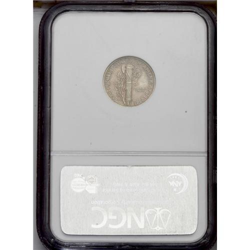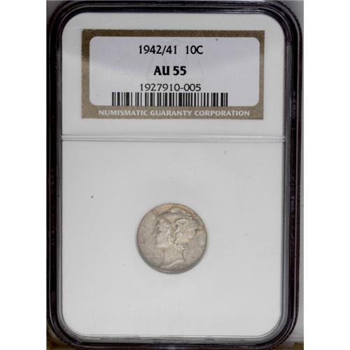 <B>1942/1<10C> AU55 NGC.</B></I> FS-010.7. Gunmetal-blue and salmon-pink coloration enriches this satiny and generally unmarked example. Slight highpoint wear precludes a finer grade. A dramatic overdate, more so than the also desirable 1942/1-D.