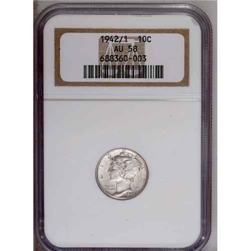 <B>1942/1<10C> AU58 NGC.</B></I> FS-010.7. This lustrous example is very close to Mint State, and probably has been sold as such in its past. Lightly toned, relatively unabraded, and indifferently struck.