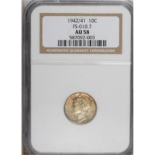 <B>1942/1 10C AU58 NGC.</B></I> FS-101, formerly FS-010.7. This is a bold overdate with the underlying numeral 1 easy to see beneath the 2 in the date. Minimally worn with just a few tiny marks, this is an attractive near-Gem example of this important key issue in the Mercury dime series. <BR><BR><B>Coin Engraver:</B> Adolph A. Weinman<BR><BR><b>Shipping:</b> Coins & Currency (<a target="_blank" href="http://www.heritageauctions.com/common/shipping.php">view shipping information</a>)