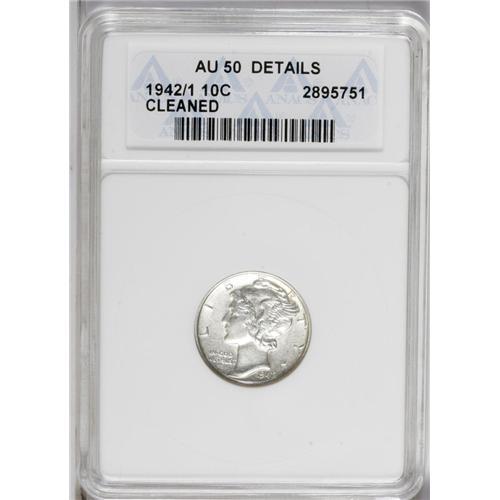 <B>1942/1<10C>--Cleaned--ANACS. AU50 Details.</B></I> A lightly worn and lightly cleaned silver-gray example of this prominent overdate. Nicely struck and appealing despite its problems.