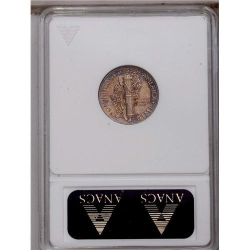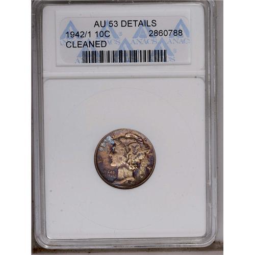 <B>1942/1<10C>--Cleaned--ANACS. AU53 Details.</B></I> Unnaturally bright for its moderate highpoint wear, and adorned in iridescent pink-orange, lavender, and ice-blue toning. The overdate is obvious, as always for the variety in better circulated grades.