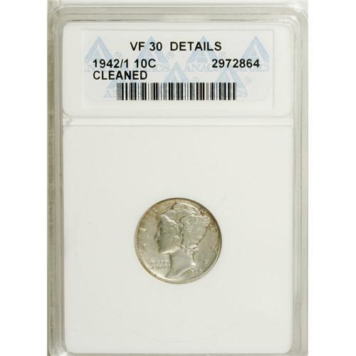 <B>1942/1 10C --Cleaned--ANACS. VF30 Details.</B></I> NGC Census: (283/1513). PCGS Population (118/843). Mintage: 205,432,336. Numismedia Wsl. Price for NGC/PCGS coin in VF30: $654. (#5036)<BR><BR><b>Shipping:</b> Coins & Currency (<a target="_blank" href="http://www.heritageauctions.com/common/shipping.php">view shipping information</a>)