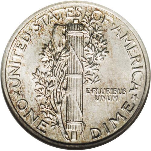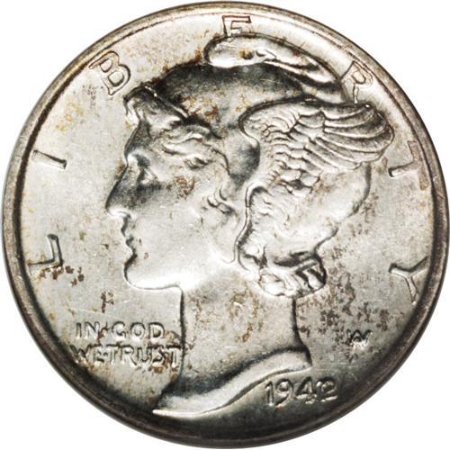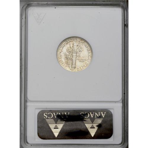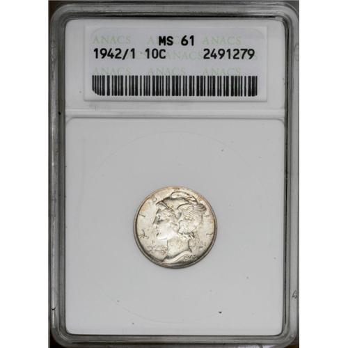 <B>1942/1<10C> MS61 ANACS.</B></I> The overdate is clearly visible on this popular key date. Dappled golden-orange and ice-blue patina adheres to bright, silvery surfaces that reveal just a few minute marks Mercury's cheek and neck, and a few barely visible wispy slide marks in the right (facing) reverse field. The design elements are well impressed, and the middle band is virtually split, though not quite fully rounded. A nice addition to an Uncirculated Mercury dime set.