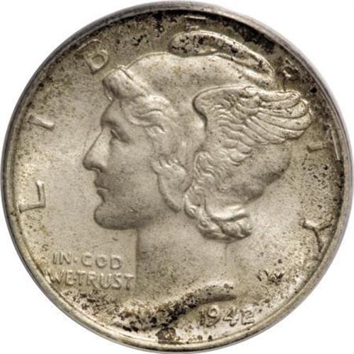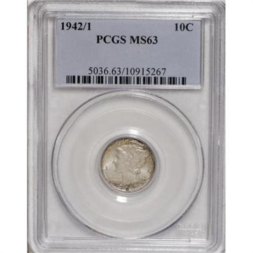 <B>1942/1 10C MS63 PCGS.</B></I> FS-101, formerly FS-010.7. Thick and frosty luster blankets both sides of this attractive representative of this ever-popular variety. Even pearl-gray toning deepens slightly to russet near the rims. Only a few shallow contact marks are noted and the strike, while not complete, is more than adequate.<BR><BR><B>Coin Engraver:</B> Adolph A. Weinman<BR><BR><b>Shipping:</b> Coins & Currency (<a target="_blank" href="http://www.heritageauctions.com/common/shipping.php">view shipping information</a>)