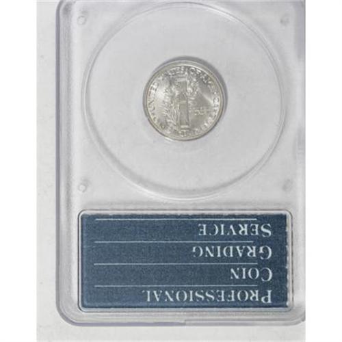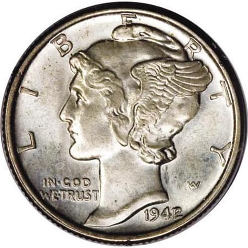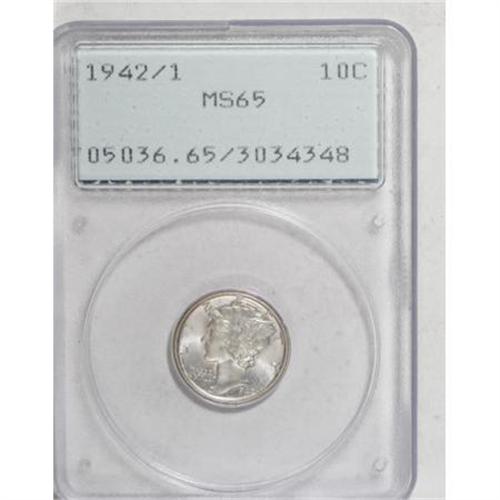 <B>1942/1 10C MS65 PCGS.</B></I> The 1942/1 Philadelphia dime was identified early on after production, unlike its 1942/1 cousin from Denver, that apparently was not even reported until about two decades later. In a November 28, 2005 <I>Coin World</B></I> article "Overdate Dimes of 1942," Eric von Klinger says the first published report of the 1942/1 Philadelphia issue apparently occurred in the March 1943 issue of the <I>Numismatic Scrapbook Magazine</B></I>, where Arnold Cohn of Kingston, NY wrote: <BR><BR>"Recently I came across a 1942 dime (I look at every coin I touch) that would pass as brilliant uncirculated and on close examination it turned out to be a 1942 over 1941. Have you heard or seen anything of this dime or can you tell me where I might get some information about it?"<BR><BR>Von Klinger goes on to say: "Soon, a large part of the whole population of the country knew about the overdate and was inspecting any new dime."<BR><BR> This Gem specimen exhibits clearly the underdigit 1, as well as the typically seen doubling on the 4. Both sides are awash in glowing luster covered with a thin coat of delicate powder-blue and tan-beige patina. A penetrating strike emboldens the design elements, and the middle bands show a fair amount of separation. Close inspection reveals no mentionable marks. Housed in a first generation PCGS holder. Population: 7 in 65, 1 finer (6/07).<BR><BR><B>Coin Engraver:</B> Adolph A. Weinman<BR><BR><b>Shipping:</b> Coins & Currency (<a target="_blank" href="http://www.heritageauctions.com/common/shipping.php">view shipping information</a>\)