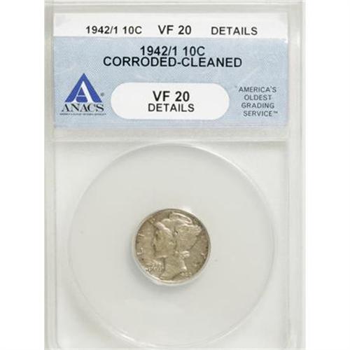 <B>1942/1 10C --Cleaned, Corroded--ANACS. VF20 Details.</B></I> NGC Census: (38/832). PCGS Population (92/1112). Mintage: 205,432,336. Numismedia Wsl. Price for NGC/PCGS coin in VF20: $600. (#5036)<BR><BR><B>Coin Engraver:</B> Adolph A. Weinman<BR><BR><b>Shipping:</b> Coins & Currency (<a target="_blank" href="http://www.heritageauctions.com/common/shipping.php">view shipping information</a>)