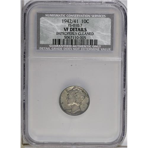 <B>1942/1 10C --Improperly Cleaned--NCS. VF Details.</B></I> FS-010.7. NGC Census: (214/1034). PCGS Population (87/1038). Mintage: 205,432,336. Numismedia Wsl. Price for NGC/PCGS coin in VF20: $600. (#5036)<BR><BR><b>Shipping:</b> Coin/Currency (<a target="_blank" href="http://www.heritageauctions.com/common/shipping.php">view shipping information</a>)