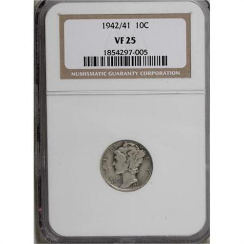 <B>1942/1 10C VF25 NGC.</B></I> NGC Census: (35/771). PCGS Population (88/978). Mintage: 205,432,336. Numismedia Wsl. Price for NGC/PCGS coin in VF25: $619. (#5036)<BR><BR><B>Coin Engraver:</B> Adolph A. Weinman<BR><BR><b>Shipping:</b> Coins & Currency (<a target="_blank" href="http://www.heritageauctions.com/common/shipping.php">view shipping information</a>\)