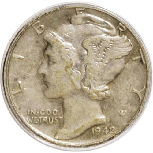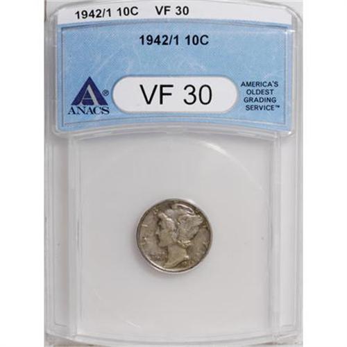 <B>1942/1 10C VF30 ANACS.</B></I> NGC Census: (68/697). PCGS Population (118/842). Mintage: 205,432,336. Numismedia Wsl. Price for NGC/PCGS coin in VF30: $654. (#5036)<BR><BR><B>Coin Engraver:</B> Adolph A. Weinman<BR><BR><b>Shipping:</b> Coins & Currency (<a target="_blank" href="http://www.heritageauctions.com/common/shipping.php">view shipping information</a>\)