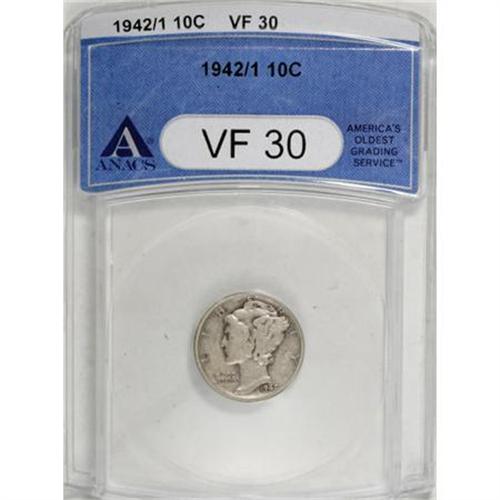 <B>1942/1 10C VF30 ANACS.</B></I> NGC Census: (70/709). PCGS Population (122/877). Mintage: 205,432,336. Numismedia Wsl. Price for NGC/PCGS coin in VF30: $654. (#5036)<BR><BR><B>Coin Engraver:</B> Adolph A. Weinman<BR><BR><b>Shipping:</b> Coins & Currency (<a target="_blank" href="http://www.heritageauctions.com/common/shipping.php">view shipping information</a>)
