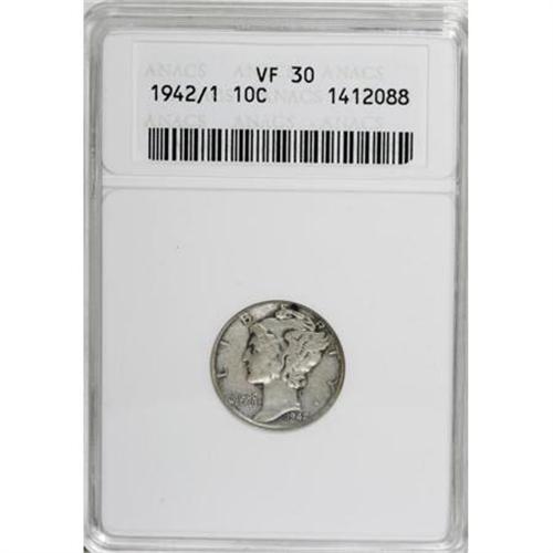 <B>1942/1 10C VF30 ANACS.</B></I> NGC Census: (74/718). PCGS Population (129/890). Mintage: 205,432,336. Numismedia Wsl. Price for NGC/PCGS coin in VF30: $654. (#5036)<BR><BR><B>Coin Engraver:</B> Adolph A. Weinman<BR><BR><b>Shipping:</b> Coins & Currency (<a target="_blank" href="http://www.heritageauctions.com/common/shipping.php">view shipping information</a>)