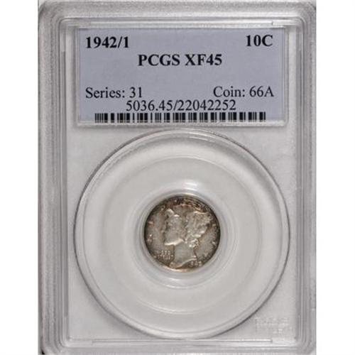 <B>1942/1 10C XF45 PCGS.</B></I> PCGS Population (152/398). NGC Census: (109/418). Mintage: 205,432,336. Numismedia Wsl. Price for NGC/PCGS coin in XF45: $889. (#5036)<BR><BR><B>Coin Engraver:</B> Adolph A. Weinman<BR><BR><b>Shipping:</b> Coins & Currency (<a target="_blank" href="http://www.heritageauctions.com/common/shipping.php">view shipping information</a>)